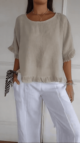 Det här är mer än en t-shirt – det är din trogna följeslagare genom lugna morgnar, kreativa stunder och spontana möten med vänner. Zarah är sydd i högkvalitativ polyester som känns mjuk och följsam mot huden, låter dig andas och ger dig frihet att röra dig. Den klassiska blå färgen och de diskreta volangdetaljerna ger en tidlös känsla med en feminin twist.